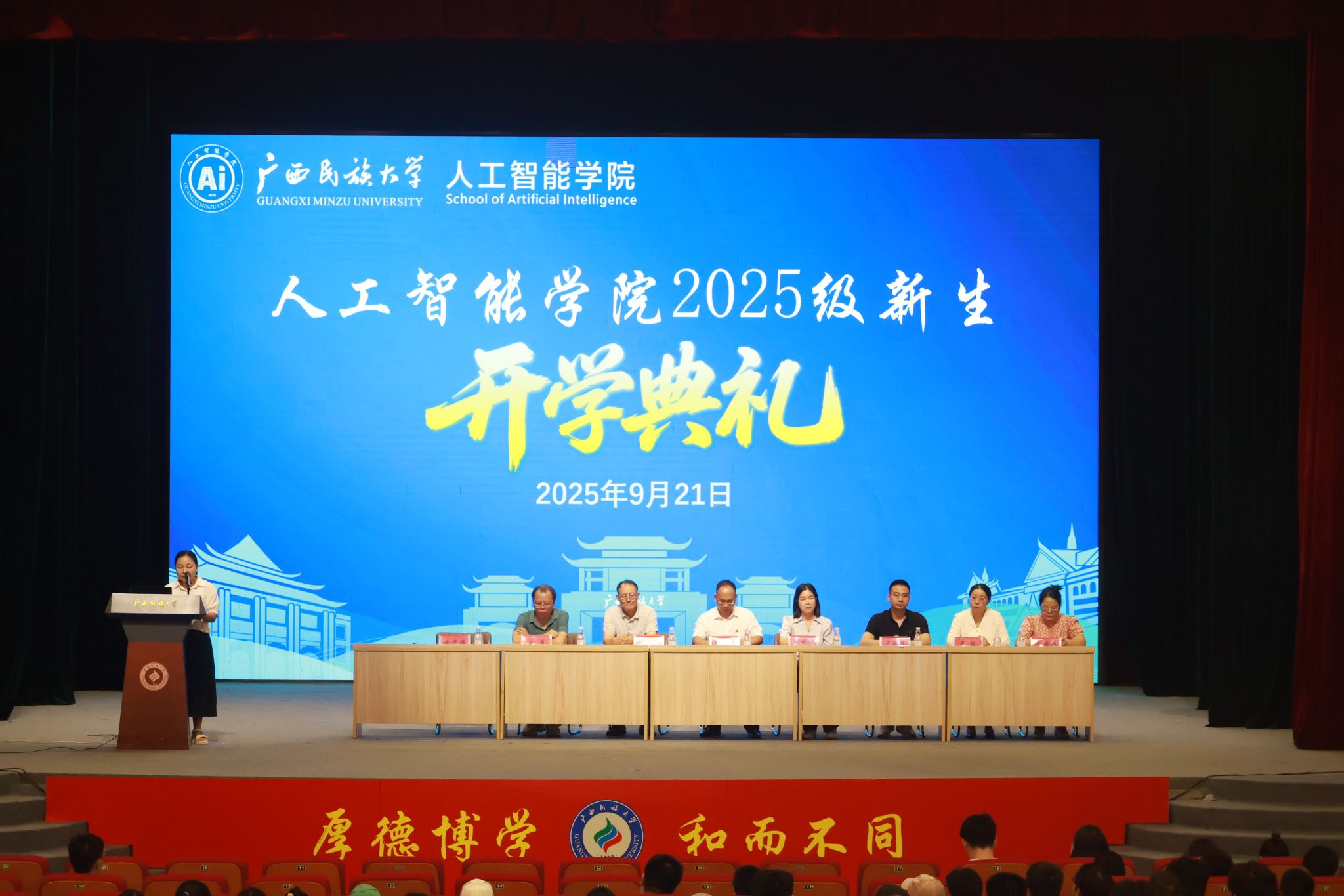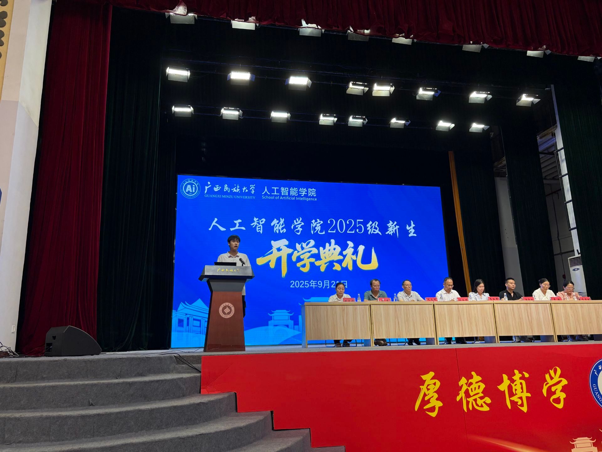 9月21日下午,广西民族大学人工智能学院2025级新生开学典礼于学校大礼堂顺利举行。学院党委书记刘志雄、院长葛丽娜、党委副书记潘彦燕、副院长文春明、各系主任、教师代表、新生班主任、辅导员和2025级全体新生参加典礼。学院党委副书记潘彦燕主持典礼,开学典礼在庄严的国歌声中拉开帷幕。