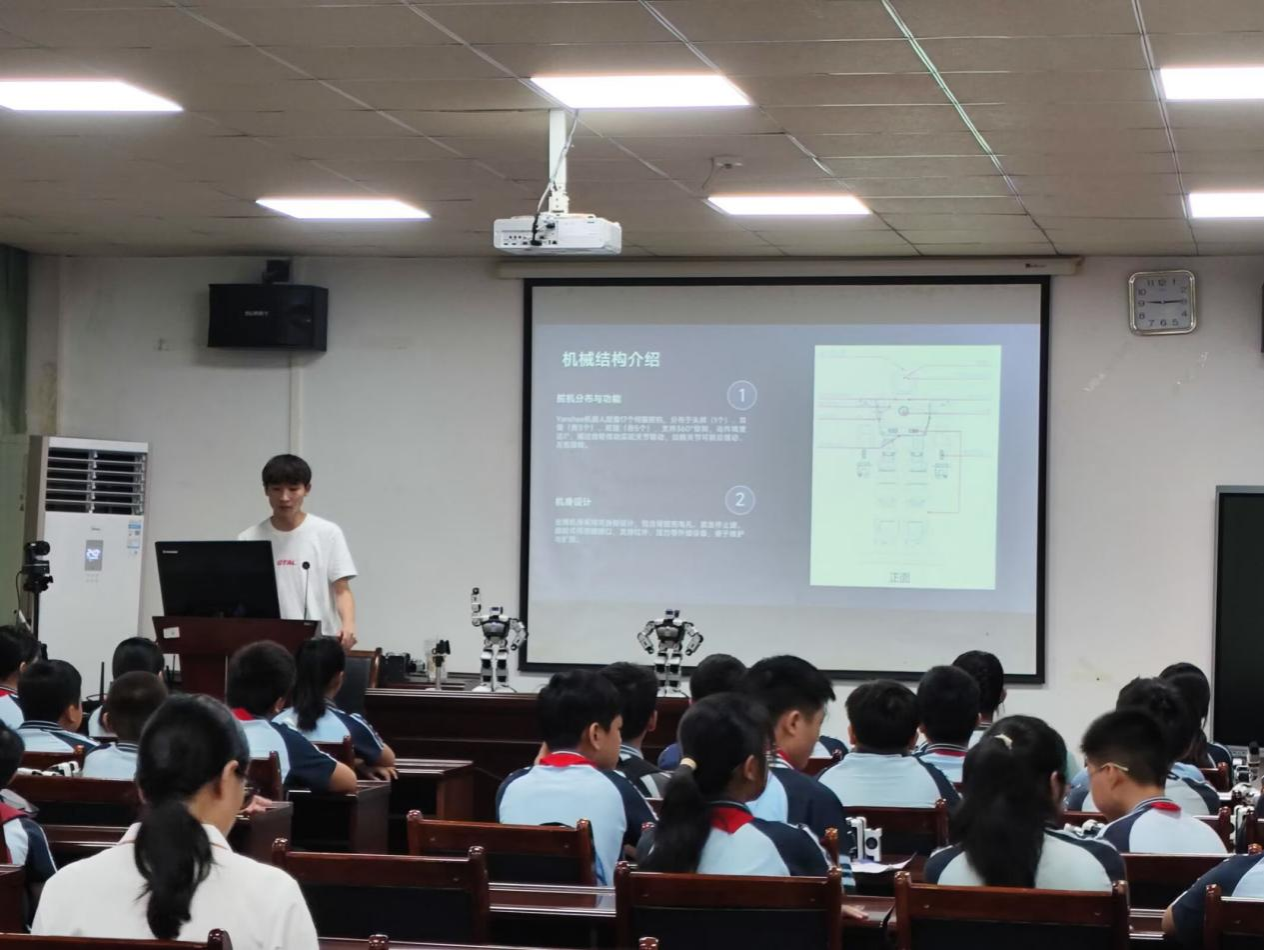 活动伊始,科技社成员化身“科学讲解员”,用通俗易懂的语言开启一场人工智能科普之旅。从教室里常见的智能语音助手,到马路上逐渐普及的自动驾驶技术;从科幻电影里的机器人形象,到现实中的工业机械臂……一个个贴近生活的话题瞬间点燃孩子们的兴趣。为了让抽象的科技概念更具象化,成员们还通过动画演示、实物模型等趣味方式,拆解“人工智能如何‘思考’”“机器学习是什么原理”等核心问题。