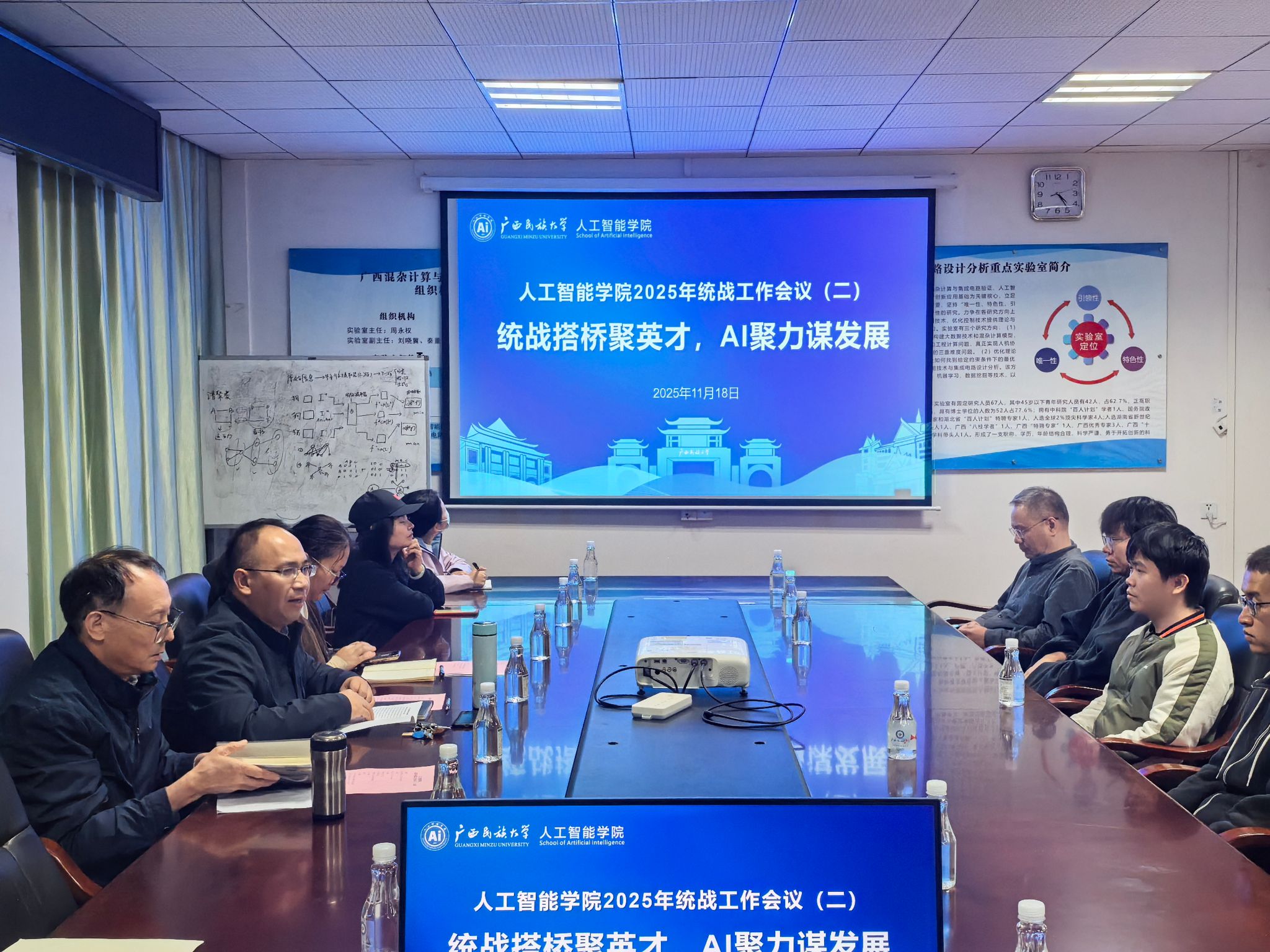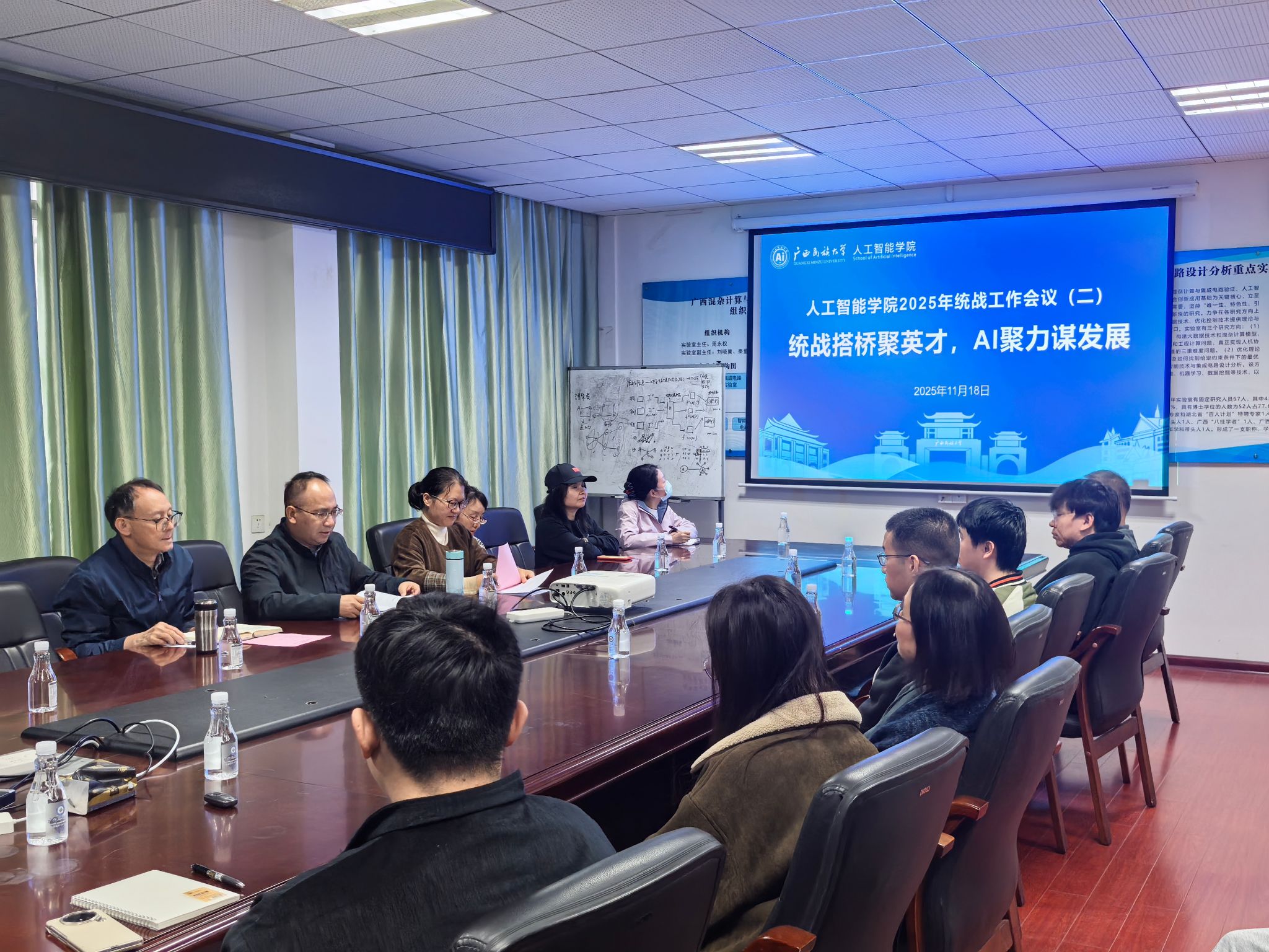 11月18日下午,我院在博达楼503会议室召开2025年第二次统战工作会议。会议以“统战搭桥聚英才,AI聚力谋发展”为主题,由学院党委副书记潘彦燕主持,学院领导班子成员及非中共党员教职工参加。