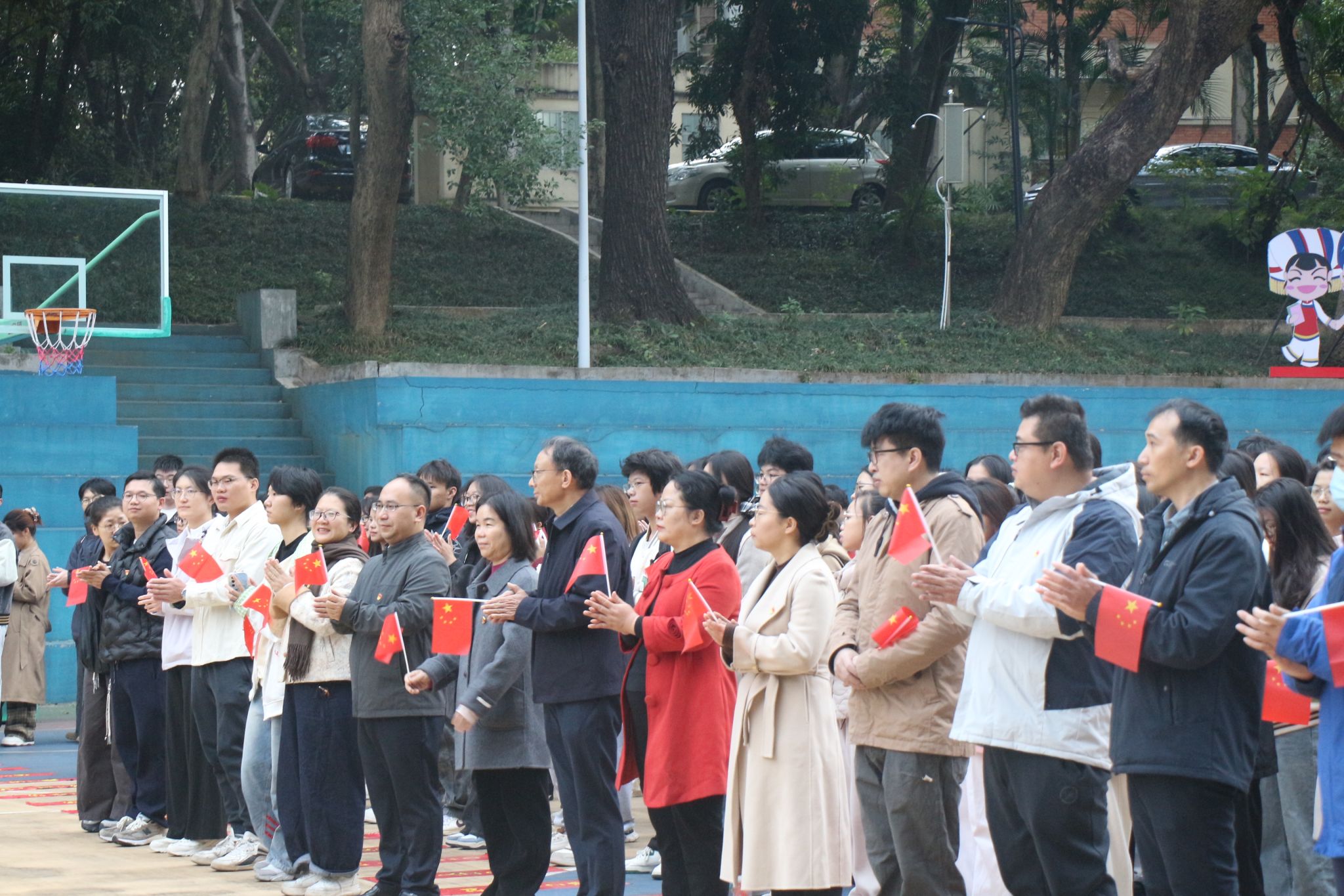 清晨的灯光球场秩序井然,师生着装整齐,静候仪式开始。伴随着《义勇军进行曲》奏响,护旗手迈着铿锵有力的步伐,护送五星红旗走向升旗台。全体师生肃立注目,在激昂的国歌声中,注视着鲜艳的国旗冉冉升起,爱国情怀与自豪感在心中激荡。