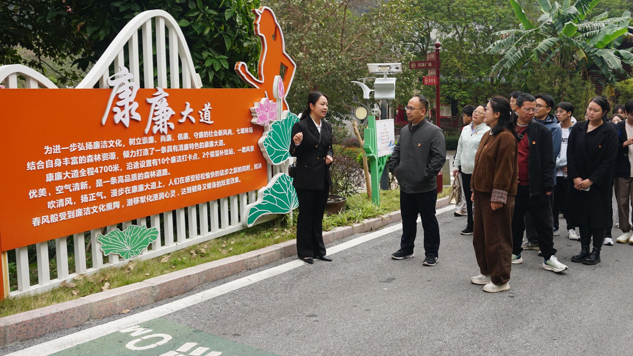 在讲解员的引导下,师生党员有序参观了基地各展区。大家步入特色剧本游场景,通过高度还原的知青工作场景,直观感受到“清风护林”的精神内涵;在廉洁文化墙前,一句句发人深省的廉洁箴言,让师生党员在驻足凝视间接受思想洗礼。随后,大家观看了反腐倡廉情景剧《手足情深》。该剧以真实案例为素材,通过鲜活的人物形象与贴近生活的情节,生动阐释了廉洁用权、坚守底线的重要性。沉浸式的观演体验,引发了在场师生的强烈共鸣。活动最后,全体党员开展了约4.7公里的徒步实践。步道沿途设有10个廉洁主题打卡点,大家在绿意葱茏的林间边走边学,在感受生态保护成果的同时交流廉洁感悟,使廉洁教育在轻松氛围中持续深化。
