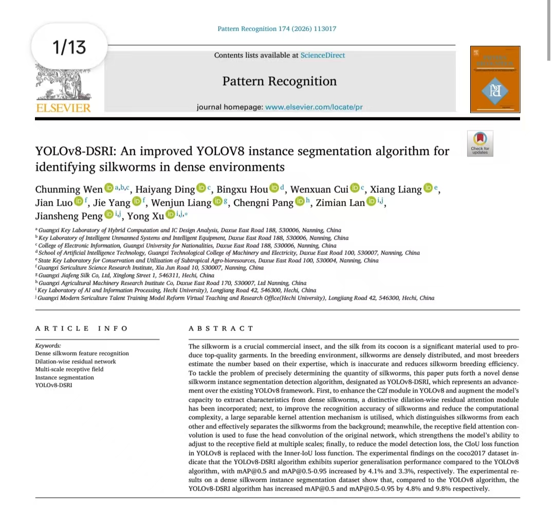 近日,我校文春明教授研究团队在农业与人工智能交叉领域取得重要突破,其研究成果“YOLOv8-DSRI: An improved YOLOv8 instance segmentation algorithm for identifying silkworms in dense environments”在人工智能与模式识别领域国际顶级期刊《Pattern Recognition》正式发表,为农业场景下的密集生物视觉检测提供了新的技术思路。