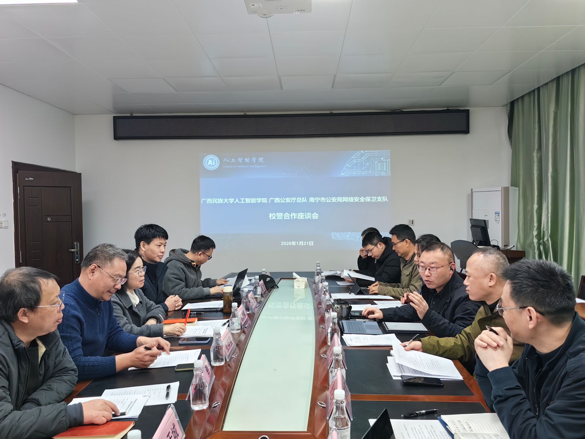2026年1月21日,人工智能学院与自治区公安厅、南宁市公安局网络安全保卫部门合作洽谈会在博达楼405会议室召开,我院院长葛丽娜、副院长王哲及教师代表参与本次会议。
