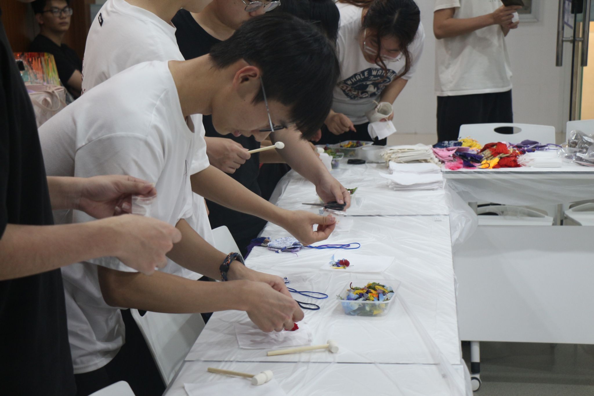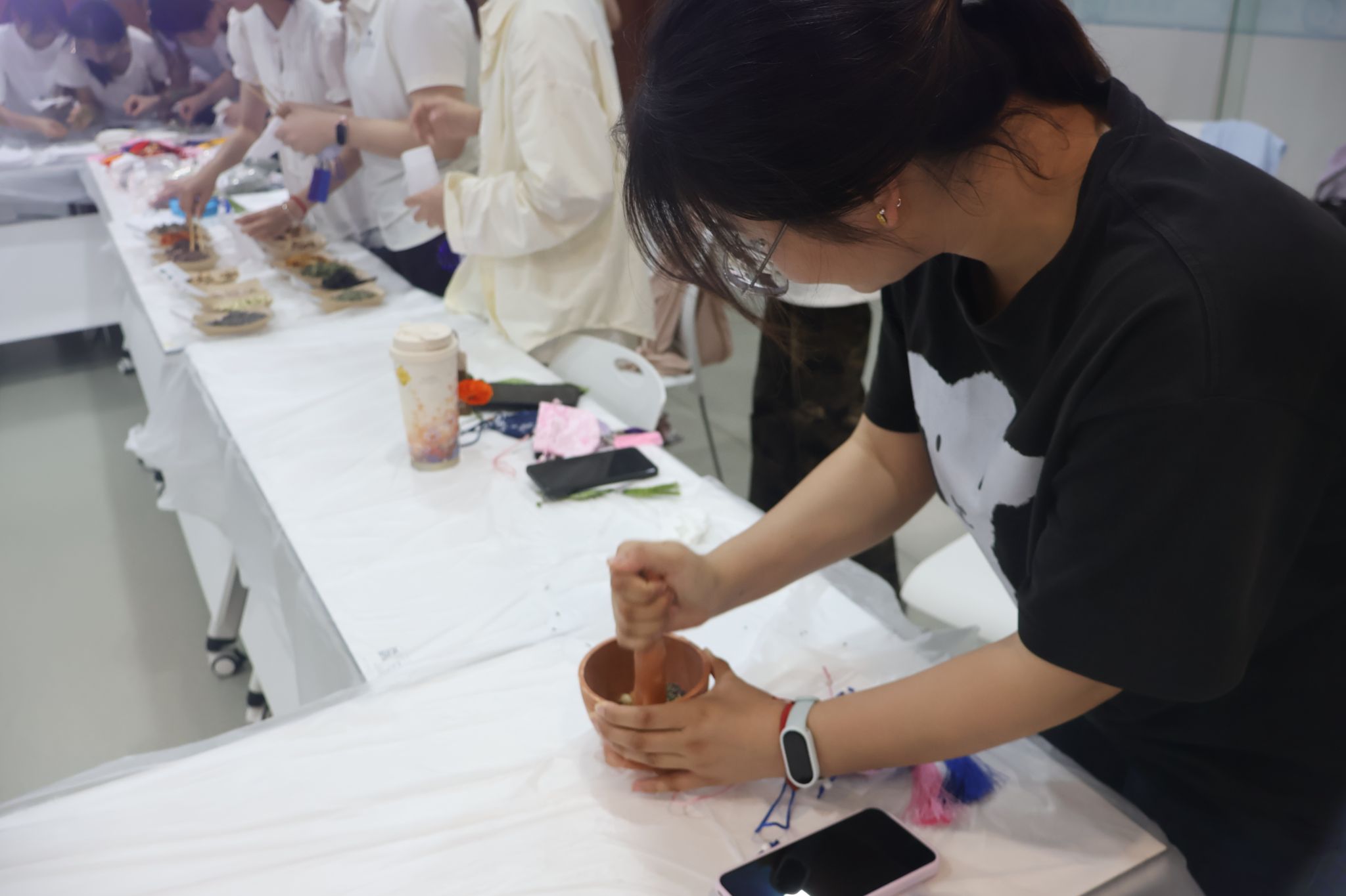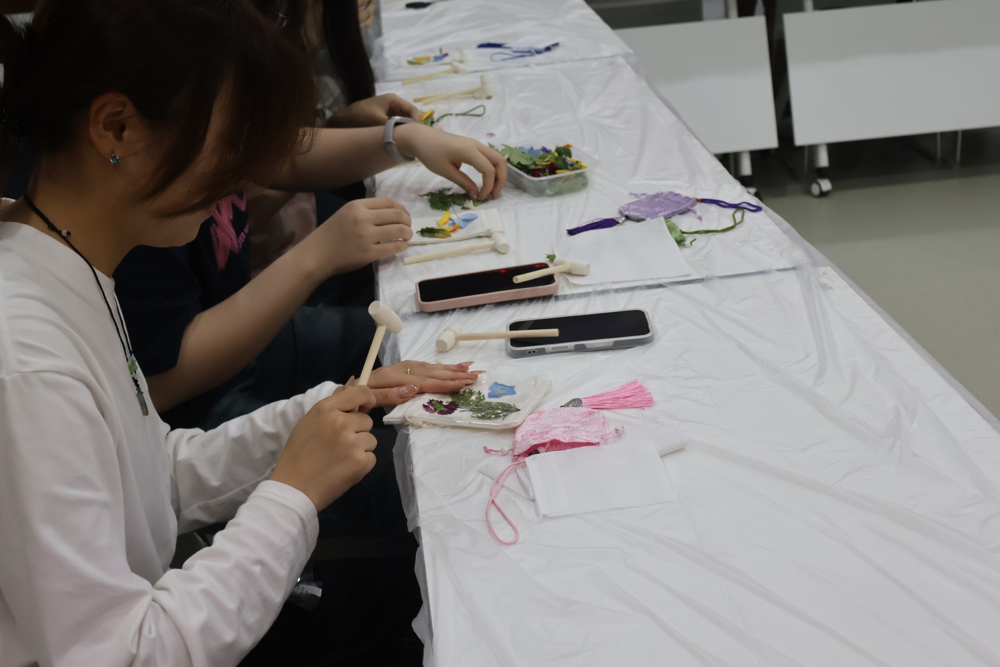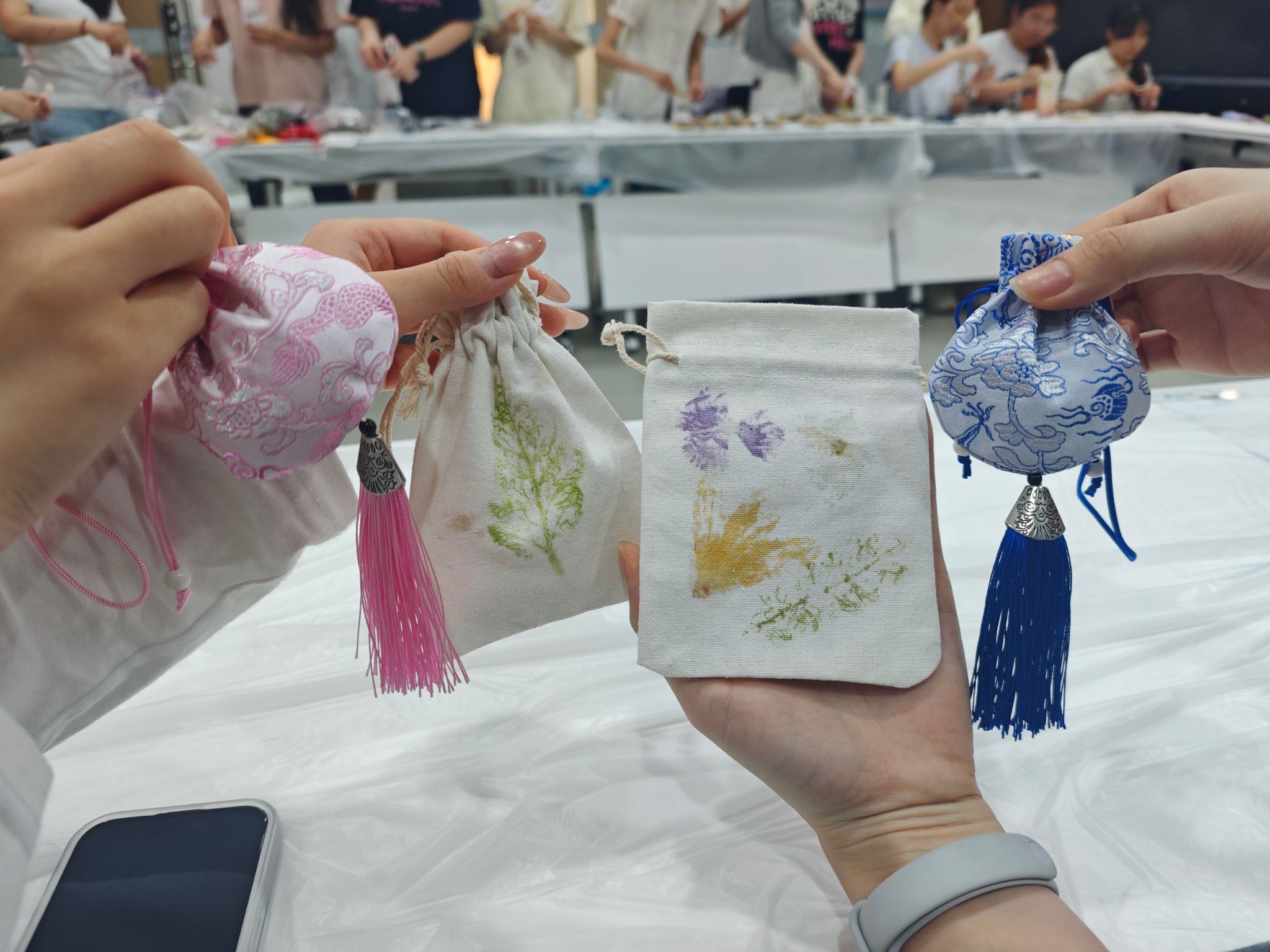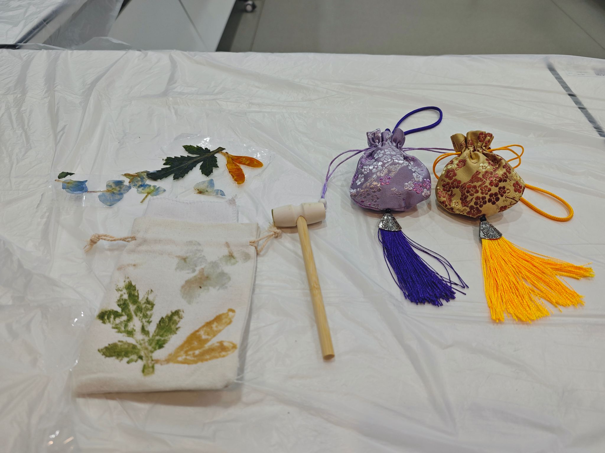 活动现场设置草本香囊制作与植物拓印两大传统手作体验环节。同学们使用学院提供的艾草、薄荷等天然草本香料与香囊布料细心制作,将清明祈福纳祥的美好寓意融入香囊包。在植物拓印区,大家使用春日枝叶、花朵,以古法拓印技艺定格自然纹理,用创意与匠心留存清明时节的盎然生机。活动过程中,同学们积极参与、热情投入,在沉浸式手作体验中感受清明节气的文化内涵与独特魅力。